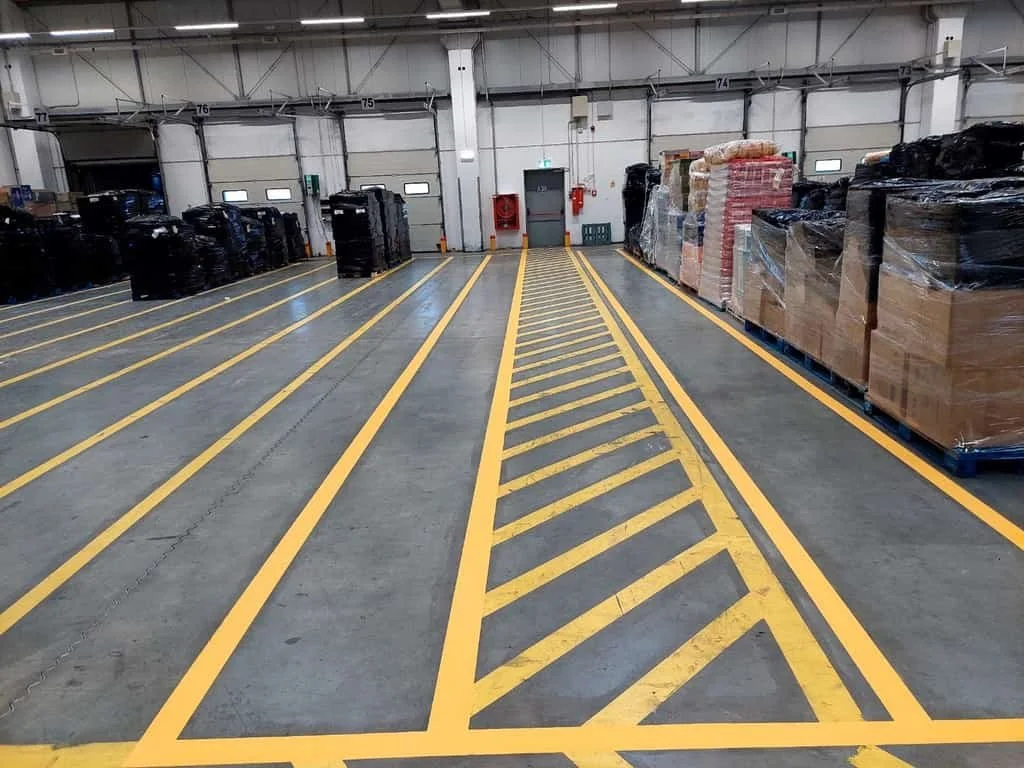 Se aplica cu vopsea rezistenta sau benzi adezive colorate , indicand rute, zone de stocare si iesiri de urgenta.